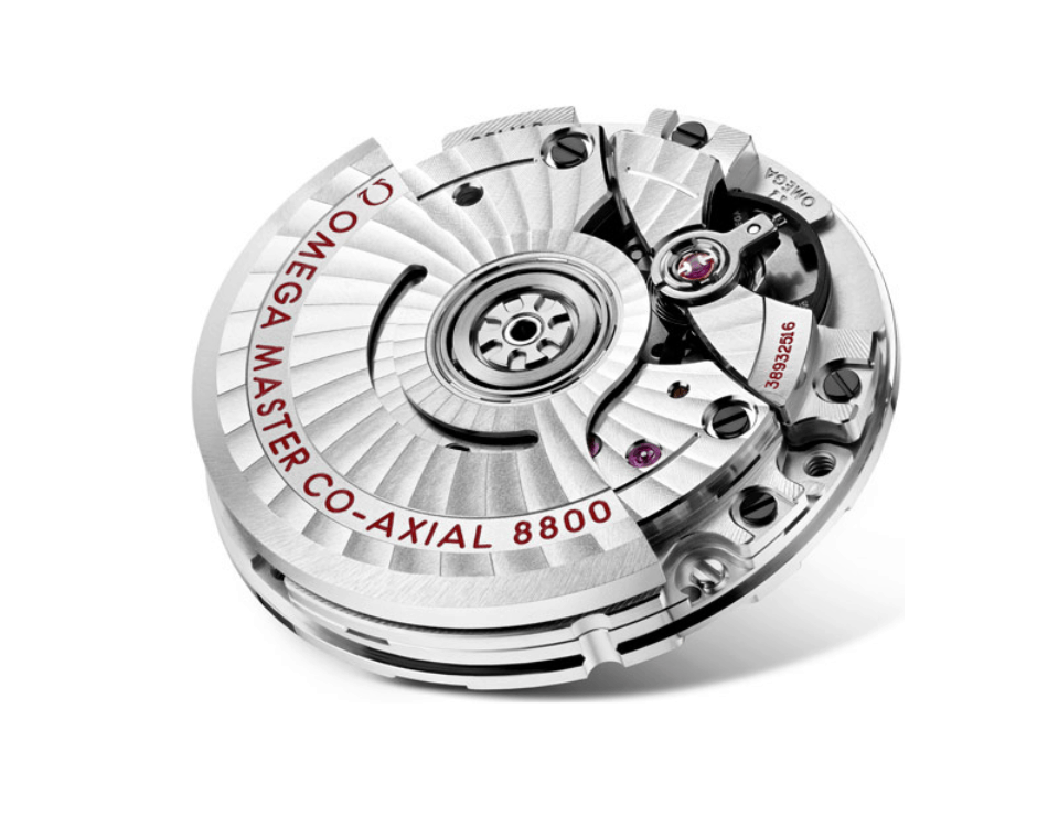 Men tilbake til kaliber 8800. Dette er en nyhet fra Omega, og den er fullpakket med funksjoner. Du har den frie balansen og balansespringen i silikon for beskyttelse mot magnetisme, en gangreserve på 55 timer, en uvanlig hastighet på 25 200 BPH (beats per hour). Det er syv beats per sekund i stedet for de vanlige åtte. 3.5HZ. Selvfølgelig har den George Daniels selvutviklede smørefrie co-aksiale ganghjulet, og ganske hyggelig, en safirkrystall i baklokket for å beundre det hele fra.
